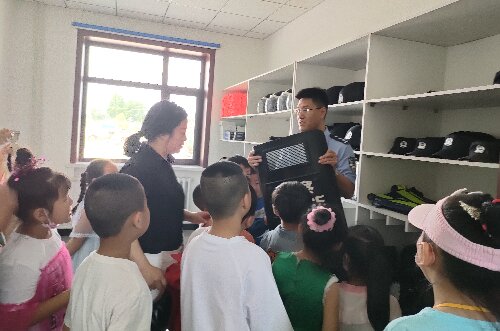 警察叔叔给小朋友介绍警用装备的功能和用途