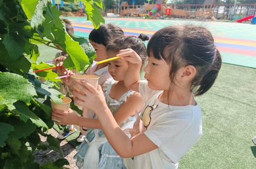 “趣体验·品习俗”环节充满节气特色。中班幼儿用吸管、纸杯收集草叶与花盆上的晨露,呼应《本草纲目》“秋露煎如饴”的记载;大班幼儿在家参与“饮秋茶”活动,感受“春茶苦,夏茶涩,要喝茶,秋白露”的俗语内涵;全园幼儿共同体验节气食俗,小班吃番薯,中班拔花生、尝花生,在品尝中了解食材价值与民间食俗说法。