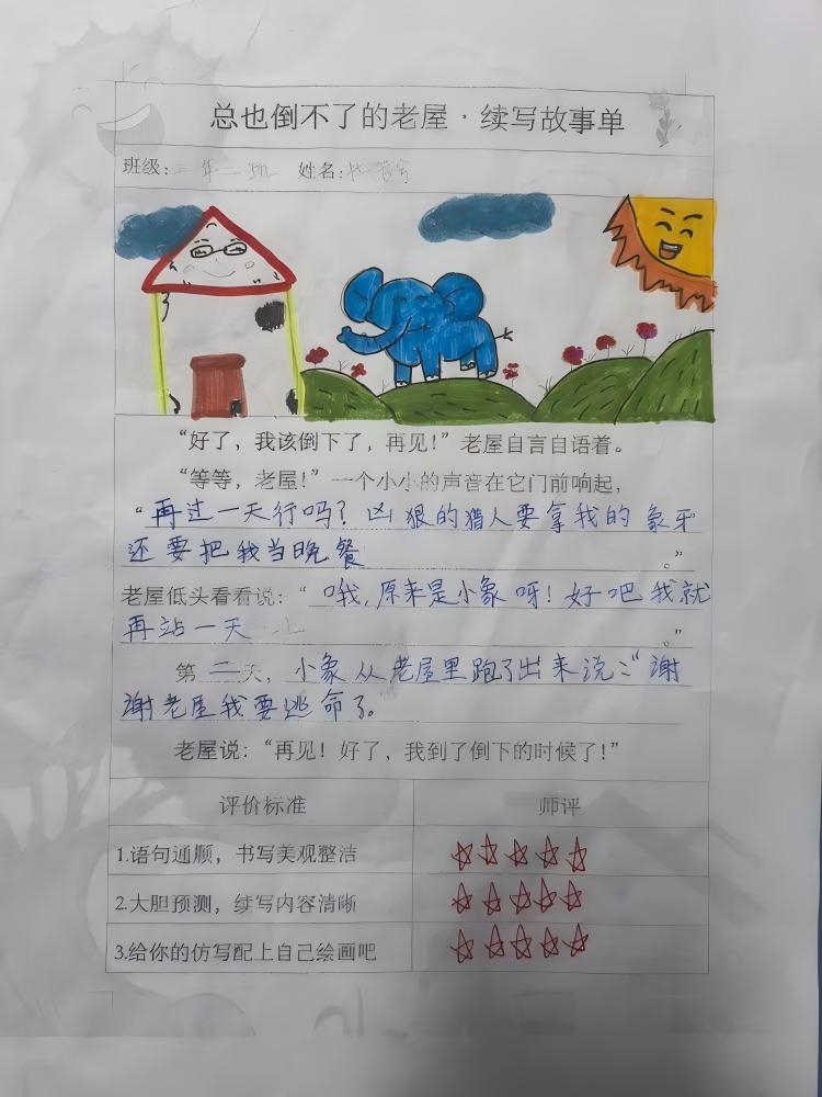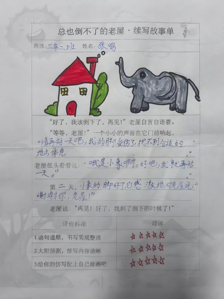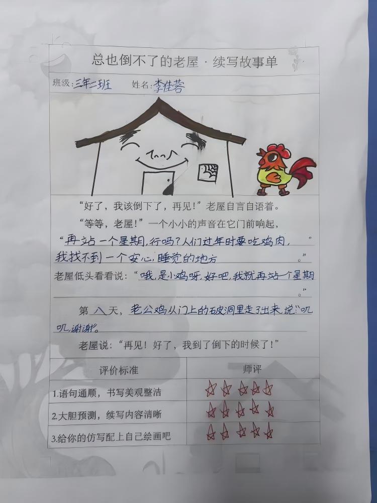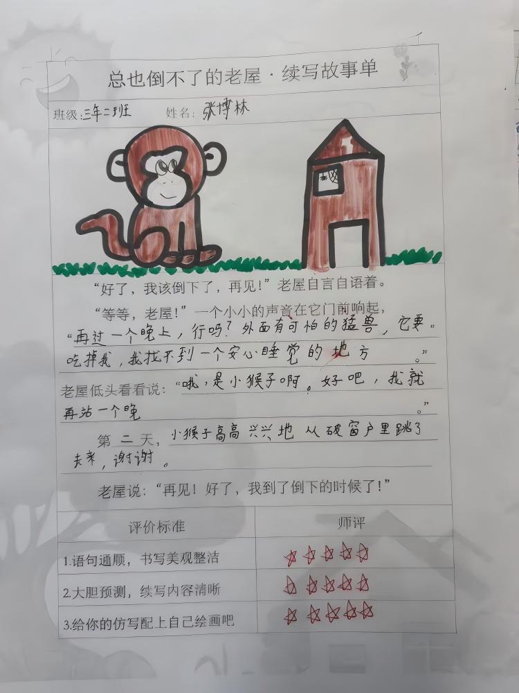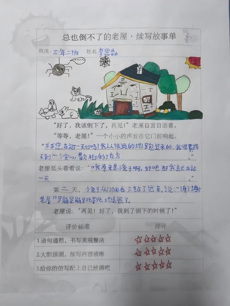 基于这堂教学课,张博老师设计的《总也倒不了的老屋·续写故事单》单元作业极具针对性。该作业聚焦“以创意作业落实‘预测’阅读策略,提升三年级学生叙事创作与逻辑推理能力”,以续写故事为载体,要求学生延续原文风格,运用预测思维构思情节,同时搭配绘画展示,实现读写绘融合,让学生在实践中深化对“预测”策略的运用。