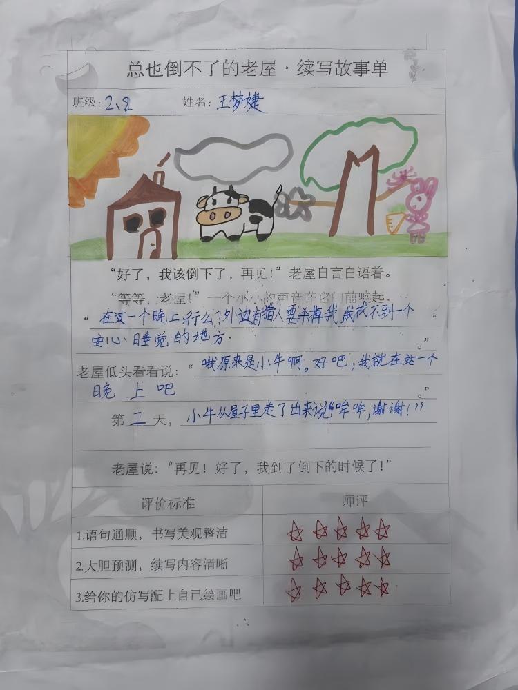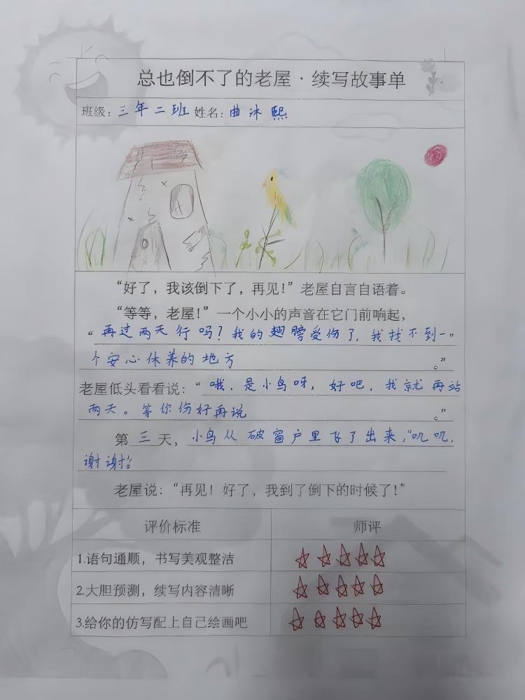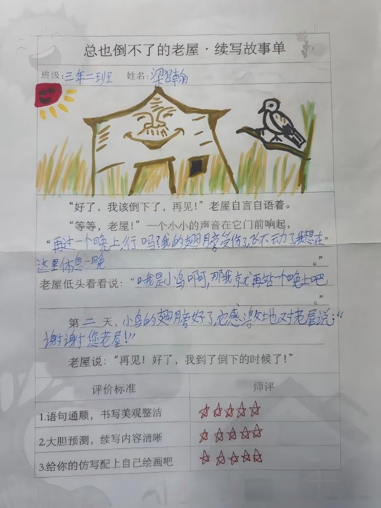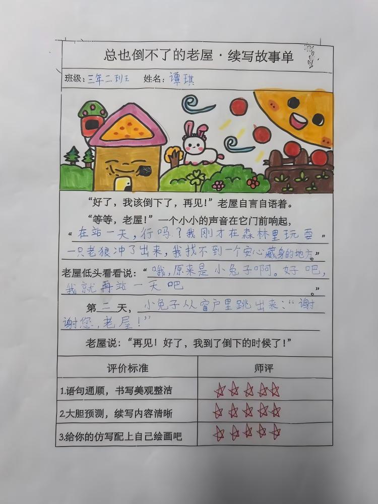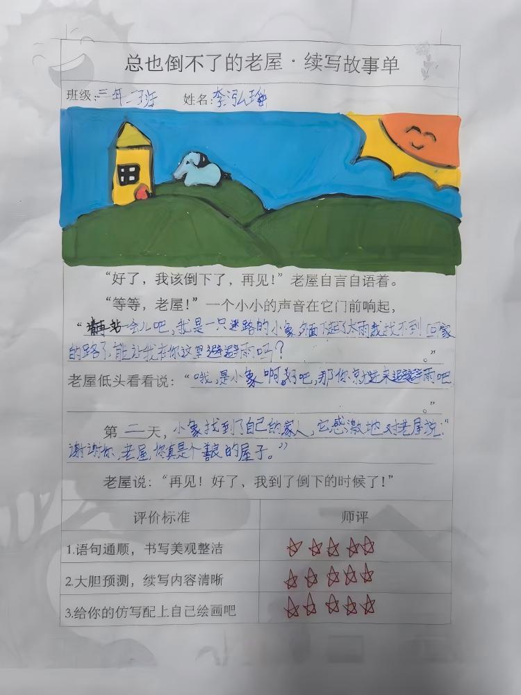 基于这堂教学课,张博老师设计的《总也倒不了的老屋·续写故事单》单元作业极具针对性。该作业聚焦“以创意作业落实‘预测’阅读策略,提升三年级学生叙事创作与逻辑推理能力”,以续写故事为载体,要求学生延续原文风格,运用预测思维构思情节,同时搭配绘画展示,实现读写绘融合,让学生在实践中深化对“预测”策略的运用。