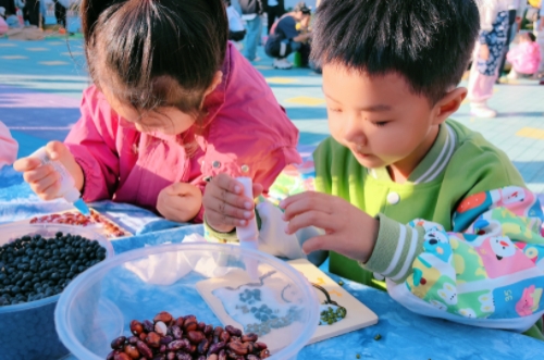 展示环节,三大区域热闹非凡。在民俗文化区“非遗创客·匠心手作坊”里,孩子们参与了“豆”趣横生的豆子拼贴、“秋林叶韵”的树叶贴画等手工活动,用自然材料创作出了一件件充满非遗韵味的作品。劳作区“粒粒辛劳·丰收魔法园”中,孩子们积极参与晒蔬果、剥玉米、处理辣椒等劳动,深刻体会到了“粒粒皆辛苦”的含义。传统小吃区“五谷丰登·老味食趣屋”内,爆米花、冰糖葫芦、葡萄果酱等美食制作活动,让萌娃们在动手间感受到了传统饮食文化的魅力。