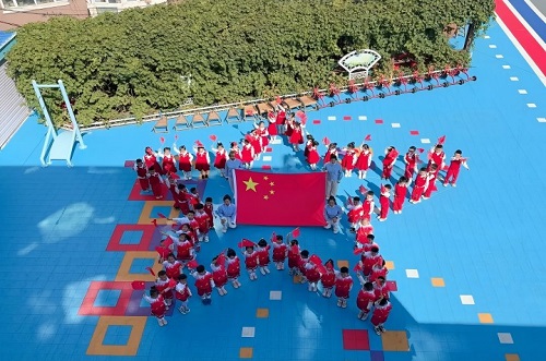 小一班《国旗国旗真美丽》:孩子们边唱边用稚嫩的动作模仿国旗飘扬,纯真的笑脸映衬着五星红旗的鲜艳。
