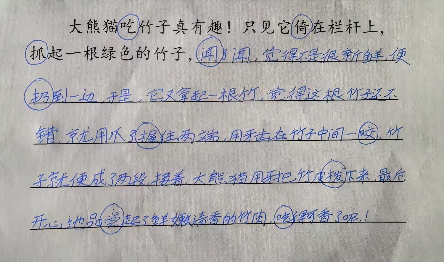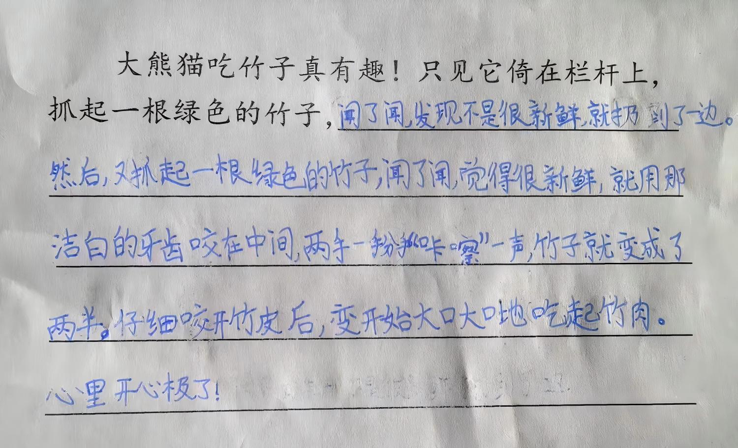 研讨环节中,作业设计组展示了本次集体备课形成的单元作业框架:以“观察能力进阶”为线索,将《搭船的鸟》作业与单元内其他课文的实践任务衔接,而本次“观察身边小动物”的作业,已收获了生动的学生作品:有学生细致描写大熊猫吃竹子的场景——“只见它倚在栏杆上,抓起一根竹子闻了闻,不新鲜就扔到一边;换了根新鲜的,用牙咬在中间,两手一掰‘咔嚓’成两半,咬开竹皮就大口吃起竹肉”;还有学生补充了更鲜活的动作细节:“它用爪子握住竹子两端,咬开竹皮后,开心地品尝鲜嫩的竹肉,吃得可香了”。这些文字里的“倚、抓、闻、咬、掰”等动词,正是课堂观察方法的直接落地。
