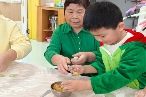 随后,孩子们来到“朱迪的新年饺子铺”。孩子们洗净小手、穿戴围裙,有模有样地学习擀皮、包馅。尽管饺子形状大小不一,但每个孩子都专注投入,体验着动手制作的乐趣,让幼儿在亲身实践中感受到传统美食制作的乐趣。