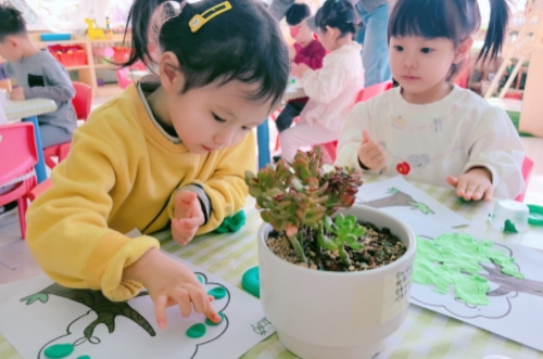 中班的孩子们则用创意与行动为春天添彩。大家开展了丰富多彩的美工创作:用黏土捏出一棵棵生机盎然的小树,用手指点画勾勒出烂漫春光,用画笔描绘心中的绿色家园。在户外,孩子们主动践行护绿承诺:不踩小草、不摘花朵、为小树细心浇水,用自己的方式守护着身边的一草一木,将对自然的热爱融入每一个小小的举动。