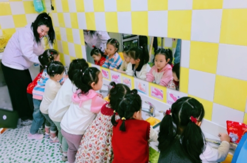 为了让孩子们熟悉幼儿园的一日生活流程,老师们还组织了生活环节的体验。在轻柔的音乐声中,孩子们有序地尝试了如厕、洗手等环节。老师耐心地引导宝贝们学习“七步洗手法”,帮助他们养成良好的卫生习惯。
